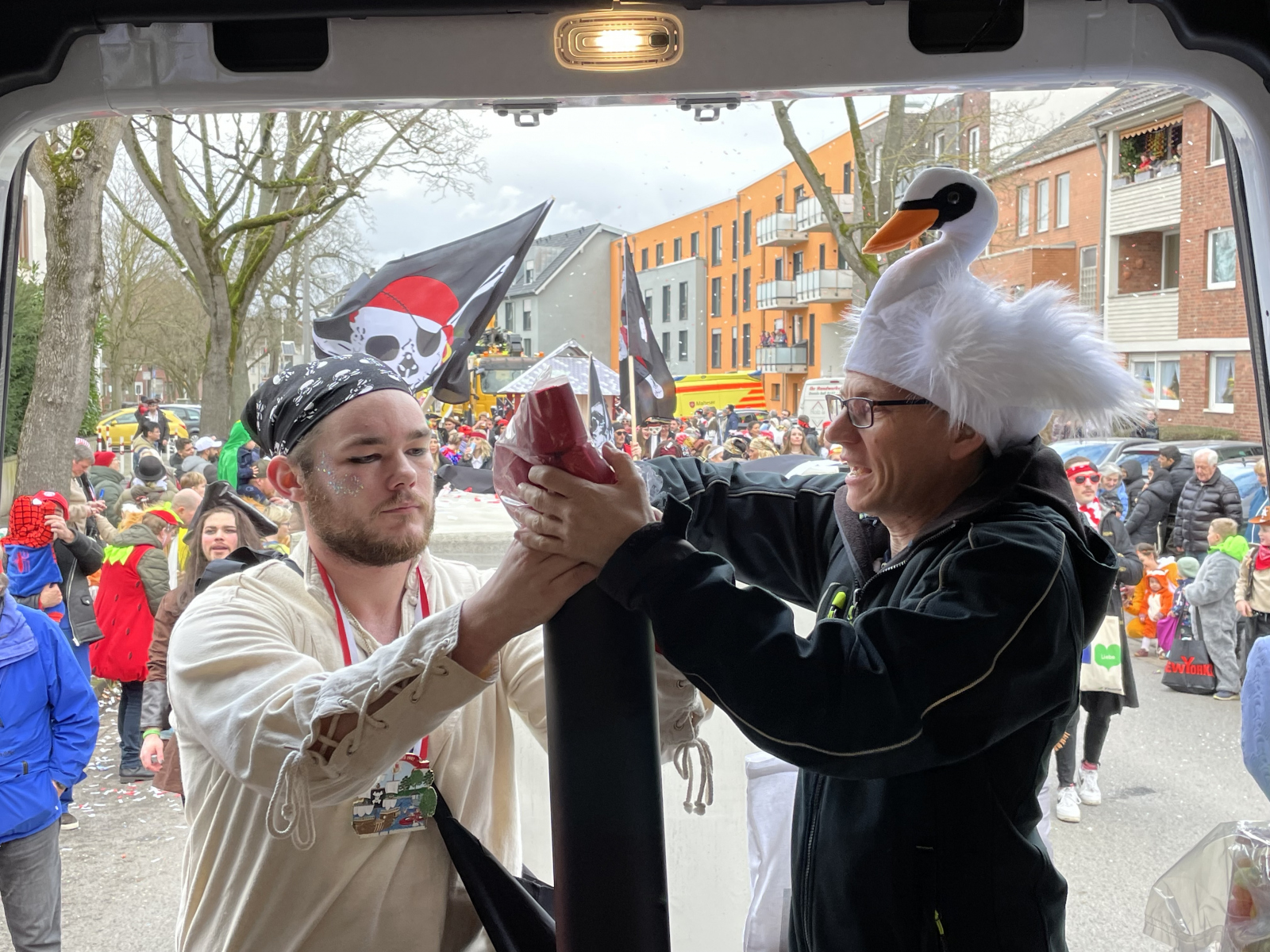 Das ULK-Programm startete (nach einem fulminanten Auftakt für die Jülicher Karnevalsvereine beim Konfettiball) am vergangenen Sonntag rund um den Kengerzoch. Etwas mehr als 100 ULK-Jecke trafen sich am Mittag vor der Garage unserer lieben Familie Müller auf der Artilleriestraße. Das Bild war dabei von vielen wunderbaren Kostümen zu unserem Sessionsmotto „Piraten am Schwanenteich“ geprägt. An dieser Stelle möchten wir Angelika und Frank Müller noch einmal herzlichst für die wunderbare Gastfreundschaft danken.