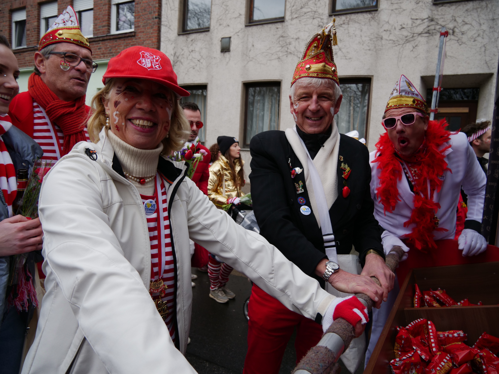Am Sonntagmittag fing alles damit an, dass sich die ULK-Familie vor der Garage unseres Kleinen-Rats-Bruders Luc Rey traf. Bei bester Verpflegung (Danke an der Stelle noch einmal an Heike Rey, die das Treffen formidabel vorbereitet hatte) stimmten sich knapp 100 ULK-Jecke auf den Kengerzoch ein, der anschließend durch unsere Herzogstadt zog. Auch in diesem Jahr haben wir den „Zoch“ wieder dazu genutzt, die rot-weißen Farben durch unsere Stadt zu tragen und das Stadtbild mit einigen Konfettischnipseln zu verschönern – sehr zur Freude unseres neuen Präsidenten Peter. Zitat: „Ich liebe Konfetti!“