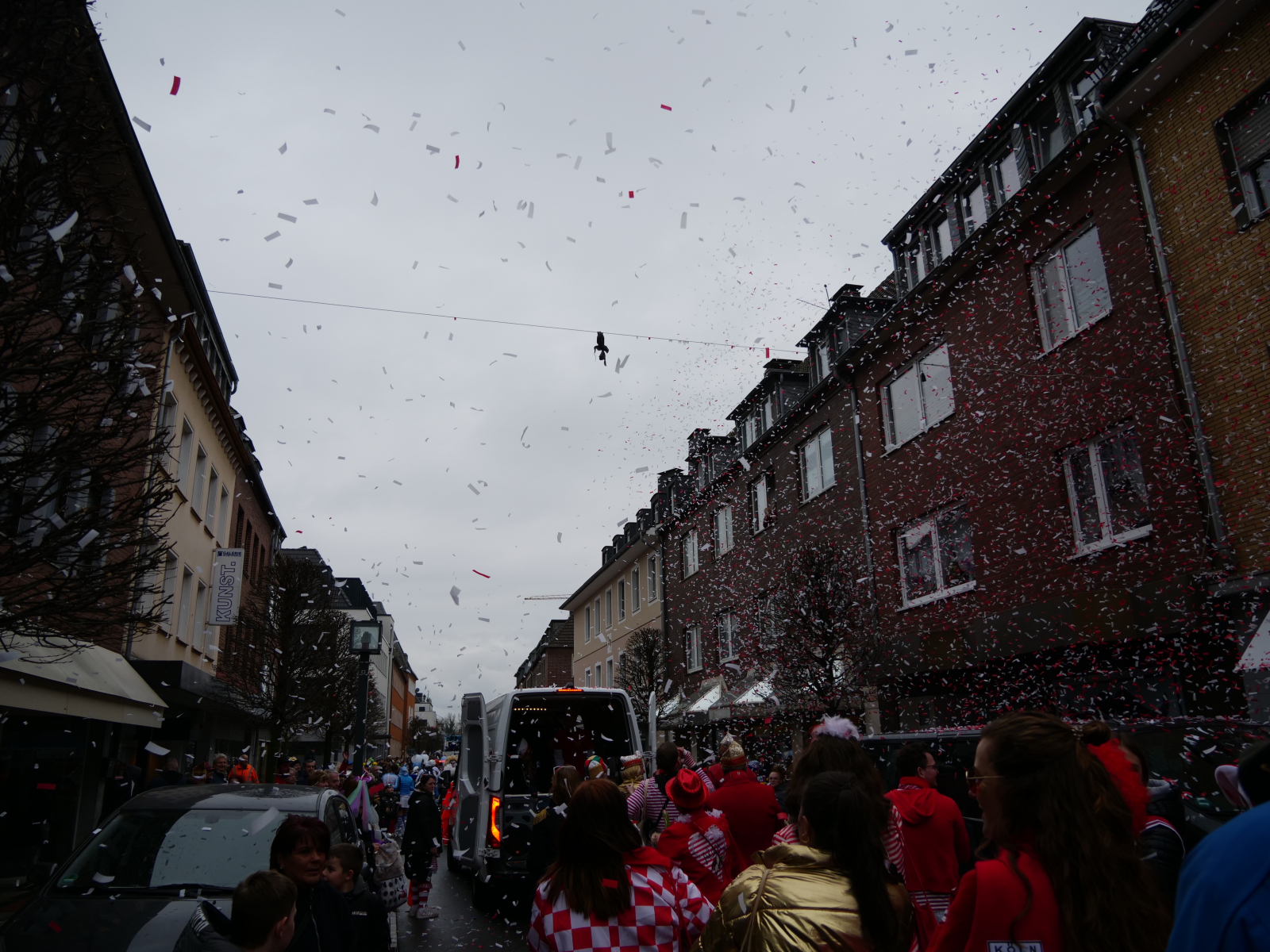 Am Sonntagmittag fing alles damit an, dass sich die ULK-Familie vor der Garage unseres Kleinen-Rats-Bruders Luc Rey traf. Bei bester Verpflegung (Danke an der Stelle noch einmal an Heike Rey, die das Treffen formidabel vorbereitet hatte) stimmten sich knapp 100 ULK-Jecke auf den Kengerzoch ein, der anschließend durch unsere Herzogstadt zog. Auch in diesem Jahr haben wir den „Zoch“ wieder dazu genutzt, die rot-weißen Farben durch unsere Stadt zu tragen und das Stadtbild mit einigen Konfettischnipseln zu verschönern – sehr zur Freude unseres neuen Präsidenten Peter. Zitat: „Ich liebe Konfetti!“
