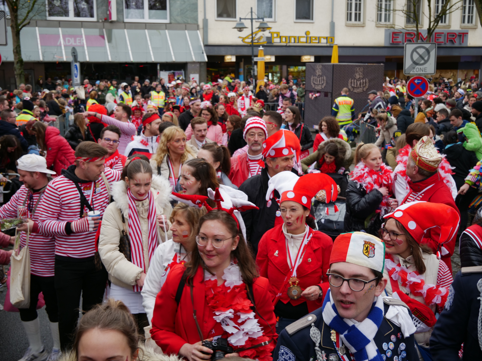 Am Sonntagmittag fing alles damit an, dass sich die ULK-Familie vor der Garage unseres Kleinen-Rats-Bruders Luc Rey traf. Bei bester Verpflegung (Danke an der Stelle noch einmal an Heike Rey, die das Treffen formidabel vorbereitet hatte) stimmten sich knapp 100 ULK-Jecke auf den Kengerzoch ein, der anschließend durch unsere Herzogstadt zog. Auch in diesem Jahr haben wir den „Zoch“ wieder dazu genutzt, die rot-weißen Farben durch unsere Stadt zu tragen und das Stadtbild mit einigen Konfettischnipseln zu verschönern – sehr zur Freude unseres neuen Präsidenten Peter. Zitat: „Ich liebe Konfetti!“