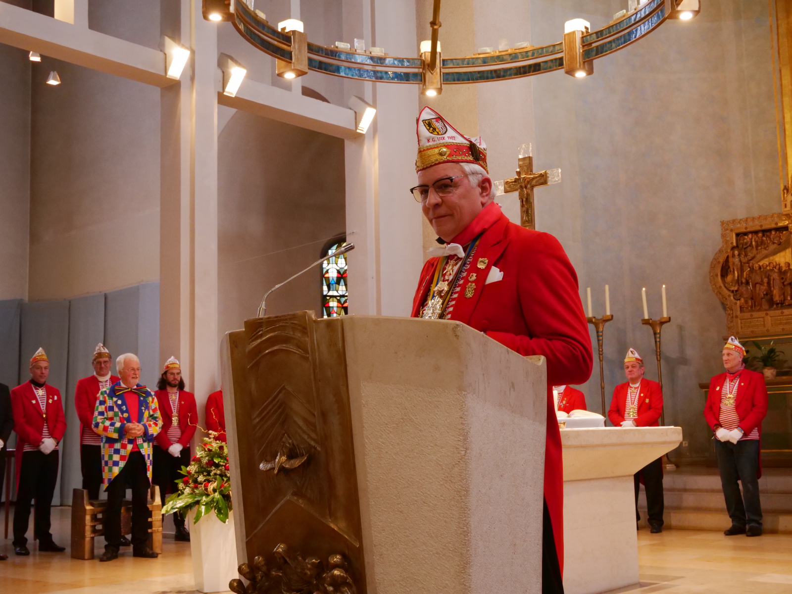 Nach einer kurzen Nacht traf sich der Kleine Rat am Rosenmontag dann schon um kurz nach 10 Uhr in der Propsteikirche mitten in Jülichs Innenstadt. Dort feierten wir unsere traditionelle Mundartmesse – unter der Leitung von Pfarrer Helmut Macherey. Die Veranstaltung war wie immer besinnlich und hielt besonders bei den auf der Orgel gespielten und lautstark mitgesungenen Karnevalsliedern einige schöne emotionale Highlights parat. Wir möchten an dieser Stelle unserem ULK-Urgestein Heino Bücher für die Organisation der Messe danken.