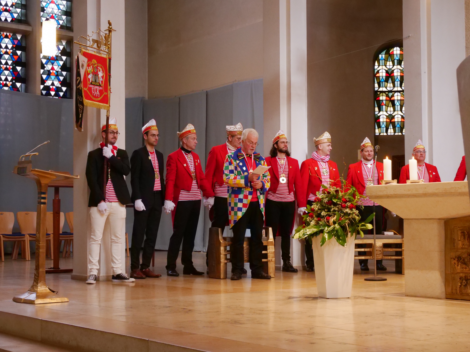 Nach einer kurzen Nacht traf sich der Kleine Rat am Rosenmontag dann schon um kurz nach 10 Uhr in der Propsteikirche mitten in Jülichs Innenstadt. Dort feierten wir unsere traditionelle Mundartmesse – unter der Leitung von Pfarrer Helmut Macherey. Die Veranstaltung war wie immer besinnlich und hielt besonders bei den auf der Orgel gespielten und lautstark mitgesungenen Karnevalsliedern einige schöne emotionale Highlights parat. Wir möchten an dieser Stelle unserem ULK-Urgestein Heino Bücher für die Organisation der Messe danken.