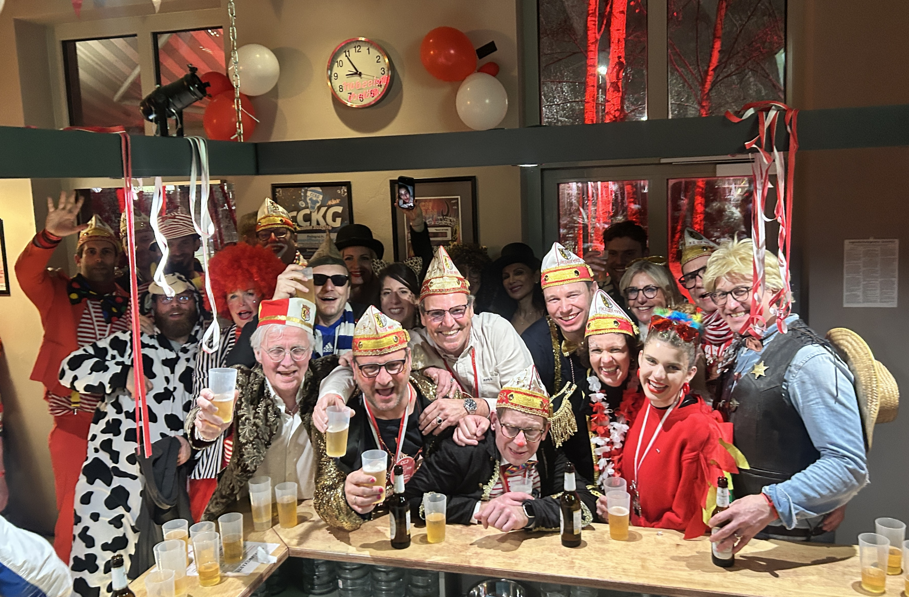Der Karnevalssonntag stand dann natürlich ganz im Zeichen des Kengerzochs, wobei sich der Kleine Rat am Morgen erst einmal zweiteilen musste: Der etwas erfahrenere Teil besuchte das Rathaus, in dem die Historische Gesellschaft Lazarus Strohmanus den Hexenturmorden an unseren Ehrenpräsidenten Jörg Bücher, ihren diesjährigen Pattühm, verlieh. Der andere Teil organisierte an der Blumenhalle die Ausgabe der Afterzoch-Bändchen sowie das Treffen der ULK-Fußgruppe vor dem Kengerzoch. Ein herzlicher Dank an dieser Stelle an Thomas Kraus, der die kompletten Getränke in der Blumenhalle sponsorte, Frank Lieth und Ferdi Wagemann für die Hot Dog-Spende sowie an Sabine Küppers, die Mutter unseres Vizepräsidenten Christoph, für einen hervorragenden Kuchen. Nach einer kleinen Wagen-Engel-Schrecksekunde unmittelbar vor dem Start des Kengerzochs, die wir an dieser Stelle aber nicht noch einmal aufrollen wollen, erlebten wir einen überraschend sonnigen und stimmigen Karnevals-Umzug 2026, den wir im Anschluss mit der ULK-Familie im Kulturbahnhof ausklingen ließen. Ein Dank an dieser Stelle an Cornel Cremer und sein Kuba-Team für die tolle Organisation!