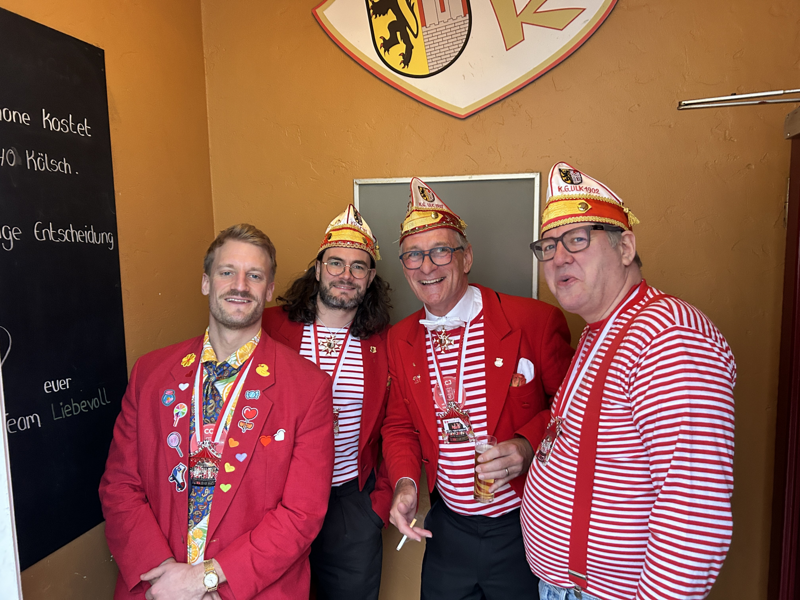 Der Karnevalssonntag stand dann natürlich ganz im Zeichen des Kengerzochs, wobei sich der Kleine Rat am Morgen erst einmal zweiteilen musste: Der etwas erfahrenere Teil besuchte das Rathaus, in dem die Historische Gesellschaft Lazarus Strohmanus den Hexenturmorden an unseren Ehrenpräsidenten Jörg Bücher, ihren diesjährigen Pattühm, verlieh. Der andere Teil organisierte an der Blumenhalle die Ausgabe der Afterzoch-Bändchen sowie das Treffen der ULK-Fußgruppe vor dem Kengerzoch. Ein herzlicher Dank an dieser Stelle an Thomas Kraus, der die kompletten Getränke in der Blumenhalle sponsorte, Frank Lieth und Ferdi Wagemann für die Hot Dog-Spende sowie an Sabine Küppers, die Mutter unseres Vizepräsidenten Christoph, für einen hervorragenden Kuchen. Nach einer kleinen Wagen-Engel-Schrecksekunde unmittelbar vor dem Start des Kengerzochs, die wir an dieser Stelle aber nicht noch einmal aufrollen wollen, erlebten wir einen überraschend sonnigen und stimmigen Karnevals-Umzug 2026, den wir im Anschluss mit der ULK-Familie im Kulturbahnhof ausklingen ließen. Ein Dank an dieser Stelle an Cornel Cremer und sein Kuba-Team für die tolle Organisation!
