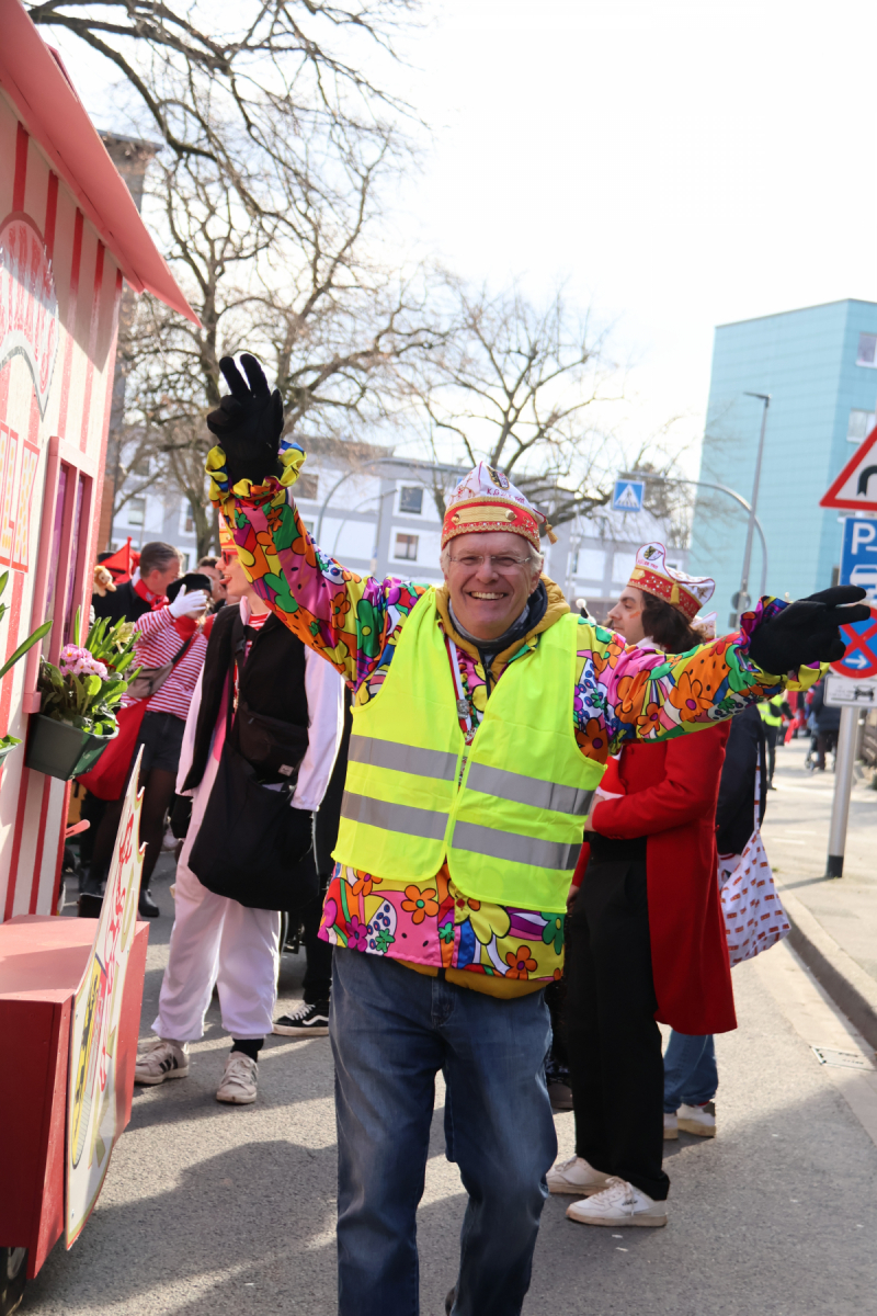 Der Karnevalssonntag stand dann natürlich ganz im Zeichen des Kengerzochs, wobei sich der Kleine Rat am Morgen erst einmal zweiteilen musste: Der etwas erfahrenere Teil besuchte das Rathaus, in dem die Historische Gesellschaft Lazarus Strohmanus den Hexenturmorden an unseren Ehrenpräsidenten Jörg Bücher, ihren diesjährigen Pattühm, verlieh. Der andere Teil organisierte an der Blumenhalle die Ausgabe der Afterzoch-Bändchen sowie das Treffen der ULK-Fußgruppe vor dem Kengerzoch. Ein herzlicher Dank an dieser Stelle an Thomas Kraus, der die kompletten Getränke in der Blumenhalle sponsorte, Frank Lieth und Ferdi Wagemann für die Hot Dog-Spende sowie an Sabine Küppers, die Mutter unseres Vizepräsidenten Christoph, für einen hervorragenden Kuchen. Nach einer kleinen Wagen-Engel-Schrecksekunde unmittelbar vor dem Start des Kengerzochs, die wir an dieser Stelle aber nicht noch einmal aufrollen wollen, erlebten wir einen überraschend sonnigen und stimmigen Karnevals-Umzug 2026, den wir im Anschluss mit der ULK-Familie im Kulturbahnhof ausklingen ließen. Ein Dank an dieser Stelle an Cornel Cremer und sein Kuba-Team für die tolle Organisation!