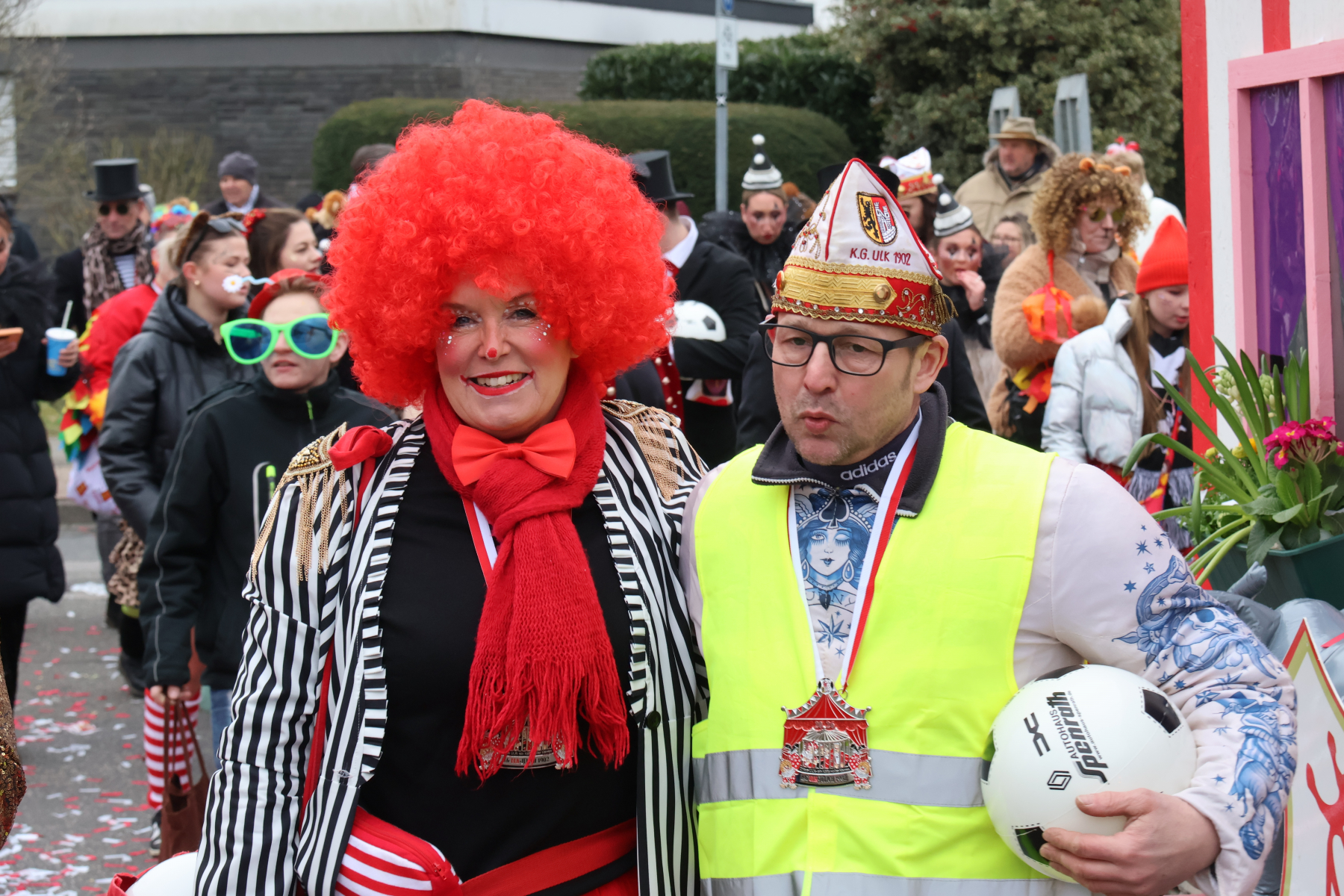 Der Karnevalssonntag stand dann natürlich ganz im Zeichen des Kengerzochs, wobei sich der Kleine Rat am Morgen erst einmal zweiteilen musste: Der etwas erfahrenere Teil besuchte das Rathaus, in dem die Historische Gesellschaft Lazarus Strohmanus den Hexenturmorden an unseren Ehrenpräsidenten Jörg Bücher, ihren diesjährigen Pattühm, verlieh. Der andere Teil organisierte an der Blumenhalle die Ausgabe der Afterzoch-Bändchen sowie das Treffen der ULK-Fußgruppe vor dem Kengerzoch. Ein herzlicher Dank an dieser Stelle an Thomas Kraus, der die kompletten Getränke in der Blumenhalle sponsorte, Frank Lieth und Ferdi Wagemann für die Hot Dog-Spende sowie an Sabine Küppers, die Mutter unseres Vizepräsidenten Christoph, für einen hervorragenden Kuchen. Nach einer kleinen Wagen-Engel-Schrecksekunde unmittelbar vor dem Start des Kengerzochs, die wir an dieser Stelle aber nicht noch einmal aufrollen wollen, erlebten wir einen überraschend sonnigen und stimmigen Karnevals-Umzug 2026, den wir im Anschluss mit der ULK-Familie im Kulturbahnhof ausklingen ließen. Ein Dank an dieser Stelle an Cornel Cremer und sein Kuba-Team für die tolle Organisation!