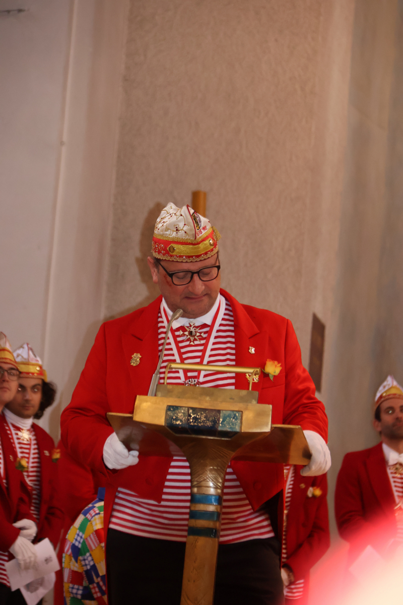 Der Morgen des Rosenmontag gehörte dann traditionell der Mundartmesse, die wir in diesem Jahr zum 20. Mal feiern durften. Entsprechend wurde der langjährige Organisator und Mit-Ideengeber Heino Bücher in der Propsteikirche auch gewürdigt – sowohl von Pfarrer Josef Wolff, der es sich wieder einmal nicht nehmen ließ die Messe zu zelebrieren, als auch von unserem Präsidenten Peter Plantikow und den anwesenden ULK-Jecken. Die Messe sorgte wieder einmal für besondere Momente, vor allem bei den Liedern – z.B. „Drink doch eine met“ oder „In unserem Veedel“ auf der Orgel. Nach eineinhalb Stunden geistigem Input ging es dann zum traditionellen Frühschoppen rüber ins Liebevoll, in dem es in diesem Jahr erstmals Fass-Runden gab. Ob das eine gute Idee ist, wissen wir noch nicht final… Ein Dank jedenfalls von Herzen an unseren Senator Ben, Julia und das gesamte Service-Team für Herzlich- und Gastfreundlichkeit. Es entwickelte sich ein gewohnt launiger Rosenmontag, der erst am Abend bei unseren Freunden von „Panciera“ sowie in diversen Jülicher Essens-Lokalitäten ein Ende fand.