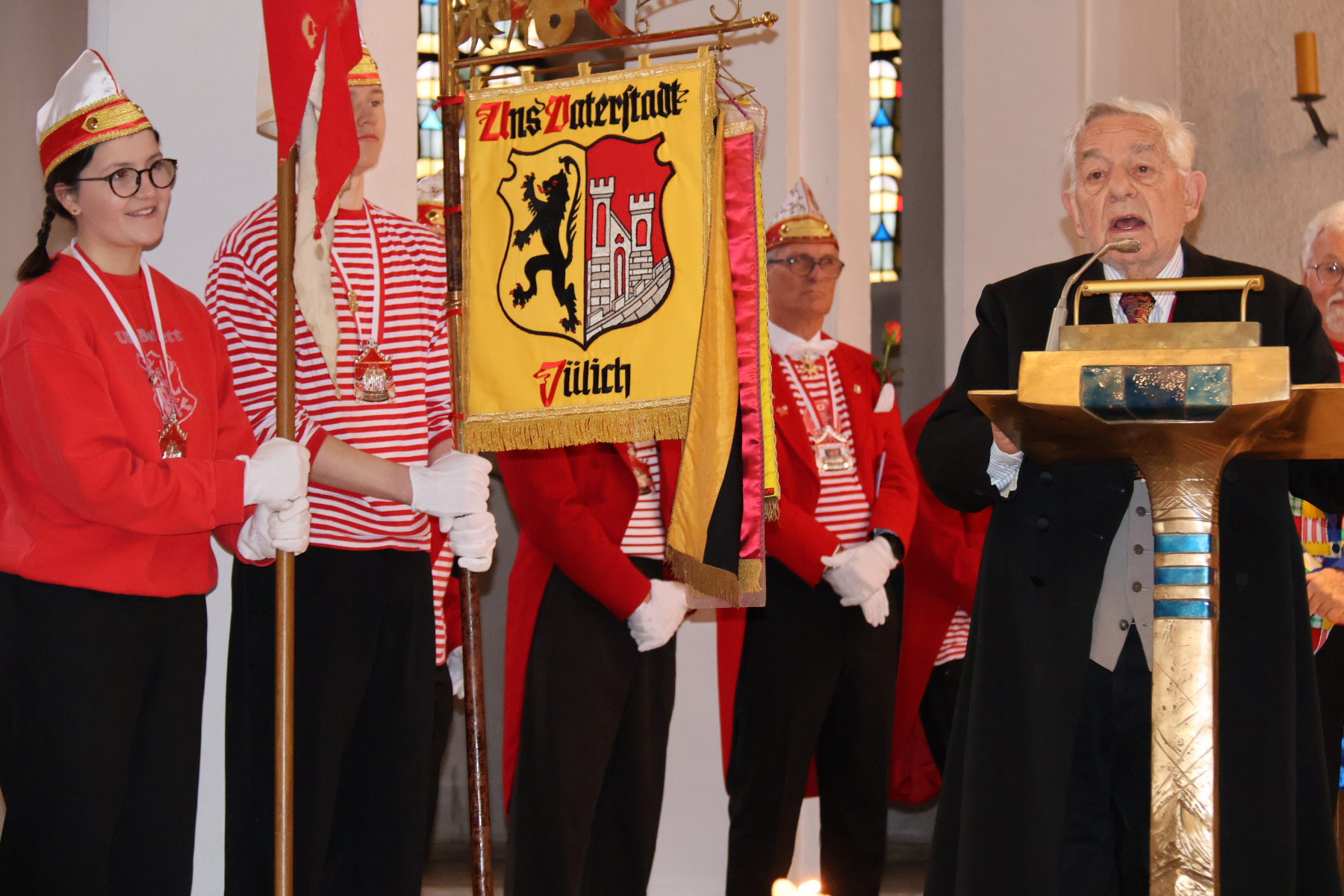 Der Morgen des Rosenmontag gehörte dann traditionell der Mundartmesse, die wir in diesem Jahr zum 20. Mal feiern durften. Entsprechend wurde der langjährige Organisator und Mit-Ideengeber Heino Bücher in der Propsteikirche auch gewürdigt – sowohl von Pfarrer Josef Wolff, der es sich wieder einmal nicht nehmen ließ die Messe zu zelebrieren, als auch von unserem Präsidenten Peter Plantikow und den anwesenden ULK-Jecken. Die Messe sorgte wieder einmal für besondere Momente, vor allem bei den Liedern – z.B. „Drink doch eine met“ oder „In unserem Veedel“ auf der Orgel. Nach eineinhalb Stunden geistigem Input ging es dann zum traditionellen Frühschoppen rüber ins Liebevoll, in dem es in diesem Jahr erstmals Fass-Runden gab. Ob das eine gute Idee ist, wissen wir noch nicht final… Ein Dank jedenfalls von Herzen an unseren Senator Ben, Julia und das gesamte Service-Team für Herzlich- und Gastfreundlichkeit. Es entwickelte sich ein gewohnt launiger Rosenmontag, der erst am Abend bei unseren Freunden von „Panciera“ sowie in diversen Jülicher Essens-Lokalitäten ein Ende fand.