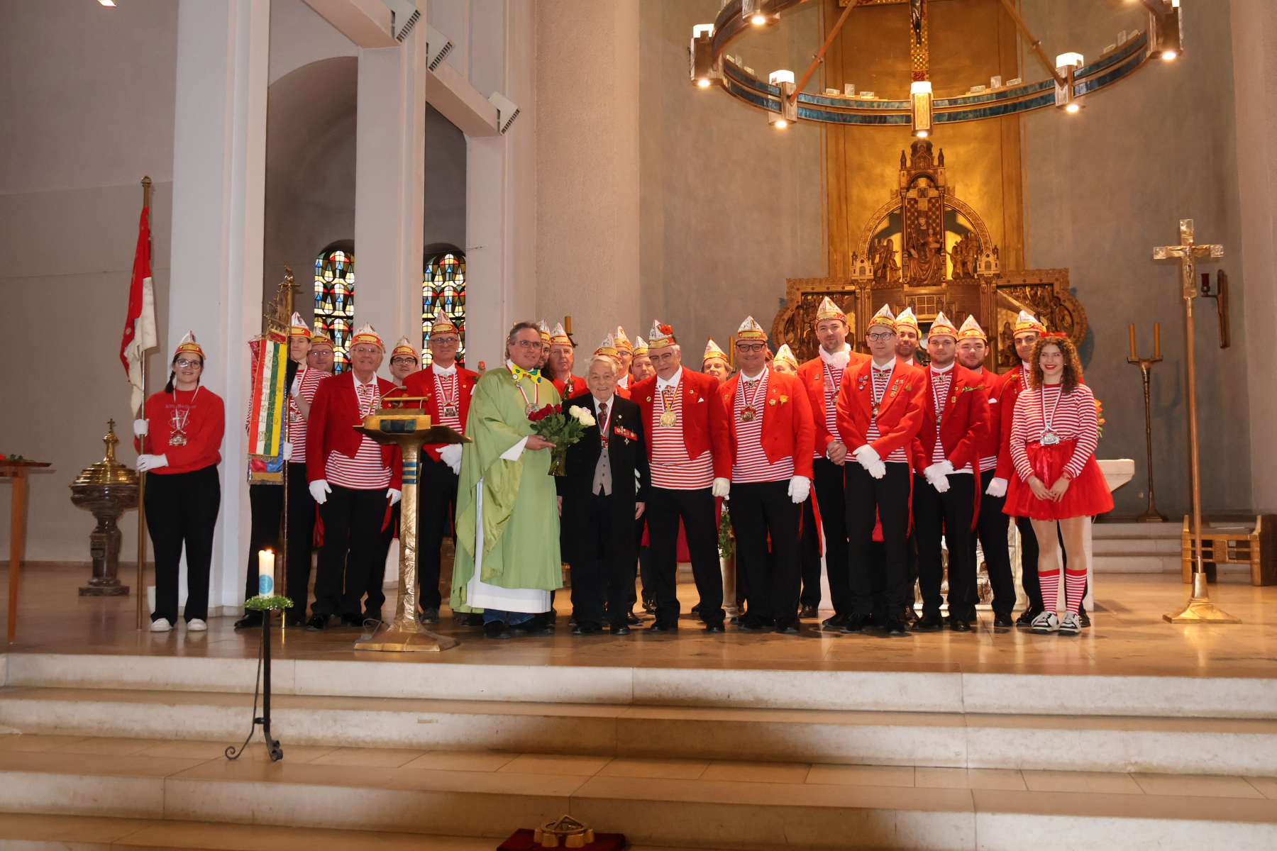 Der Morgen des Rosenmontag gehörte dann traditionell der Mundartmesse, die wir in diesem Jahr zum 20. Mal feiern durften. Entsprechend wurde der langjährige Organisator und Mit-Ideengeber Heino Bücher in der Propsteikirche auch gewürdigt – sowohl von Pfarrer Josef Wolff, der es sich wieder einmal nicht nehmen ließ die Messe zu zelebrieren, als auch von unserem Präsidenten Peter Plantikow und den anwesenden ULK-Jecken. Die Messe sorgte wieder einmal für besondere Momente, vor allem bei den Liedern – z.B. „Drink doch eine met“ oder „In unserem Veedel“ auf der Orgel. Nach eineinhalb Stunden geistigem Input ging es dann zum traditionellen Frühschoppen rüber ins Liebevoll, in dem es in diesem Jahr erstmals Fass-Runden gab. Ob das eine gute Idee ist, wissen wir noch nicht final… Ein Dank jedenfalls von Herzen an unseren Senator Ben, Julia und das gesamte Service-Team für Herzlich- und Gastfreundlichkeit. Es entwickelte sich ein gewohnt launiger Rosenmontag, der erst am Abend bei unseren Freunden von „Panciera“ sowie in diversen Jülicher Essens-Lokalitäten ein Ende fand.
