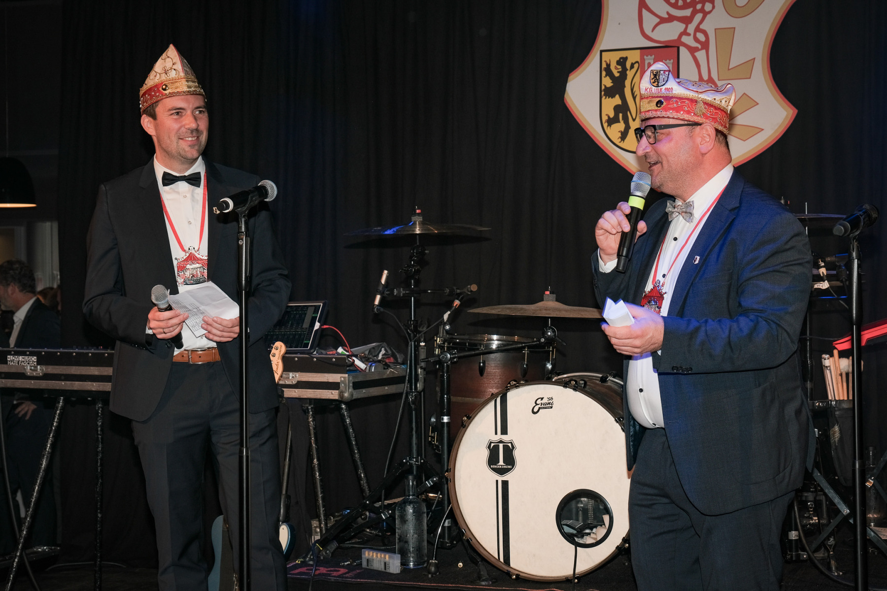 Am Abend traf sich der Kleine Rat dann bereits gegen 18.30 Uhr zu letzten Absprachen und einem gemeinsamen Foto. Die Blumenhalle war wieder einmal festlich geschmückt – Danke deshalb an ULK-Baumeister Lars Zopp und viele fleißige Unterstützer im Vorfeld. Am Abend trudelten die ersten Jecken bereits gegen 19.15 Uhr ein. Etwas mehr als eine Stunde später begrüßten dann Präsident Peter Plantikow und Vize-Präsident Christoph Küppers offiziell die vielen wunderbar in Abendgarderobe geworfenen Gäste!