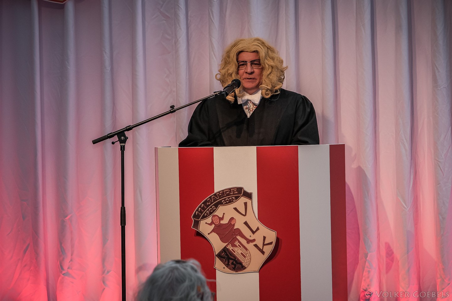 Im Anschluss gab es ein Comeback – und zwar das eines ULK-Redners in der Bütt. Nach diversen Jahren ohne eigene Büttenrede der KG ULK wagte sich unser Ehrenpräsident Jörg Bücher auf die Bühne. In der Rolle des „Anklägers“ bat er das Kleine Rats-Mitglied Horst B. zum Rapport. Mögliche Blutsverwandtschaften sind an dieser Stelle nicht auszuschließen.. Mit einigen lustigen Insider-Geschichten und mit dem wiederholten Sprachbild des „Frikadellentänzers“ sorgte „der Ankläger“ immer wieder für Schmunzler im Saal.