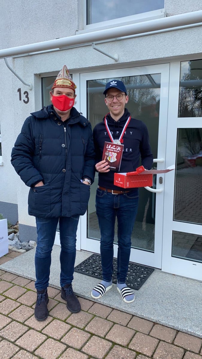 Trotz dieser Generalabsage machte sich der Kleine Rat viele Gedanken über den persönlichen Kontakt zu seinen Senatorinnen und Senatoren, die unserer Gesellschaft in bemerkenswerter Weise ihre Treue hielten. Dafür an dieser Stelle nochmal ein riesiger Dank. Und so kam es, dass wir vor Weihnachten – im Dezember 2020 – unsere sogenannten „ULK-Boxen“ zu den Senatorinnen und Senatoren nach Hause brachten. Darin unter anderem der Sessionsorden, eine ULK-Maske, ein Prosecco, eine Konfettikanone oder eine rote Clownsnase. Außerdem lag in jeder Box unser Sessionsmagazin, das in anderer Form über die Geschehnisse rund um unsere KG berichtete: So wurden im Heft die 22 neuen Senatorinnen und Senatoren sowie die 3 neuen Jugendsenatsmitglieder vorgestellt oder ein Interview mit unserem ULK-Vize und Bürgermeister Axel Fuchs veröffentlicht. Impressionen vom Verteilen unserer ULK-Box gibt es hier: