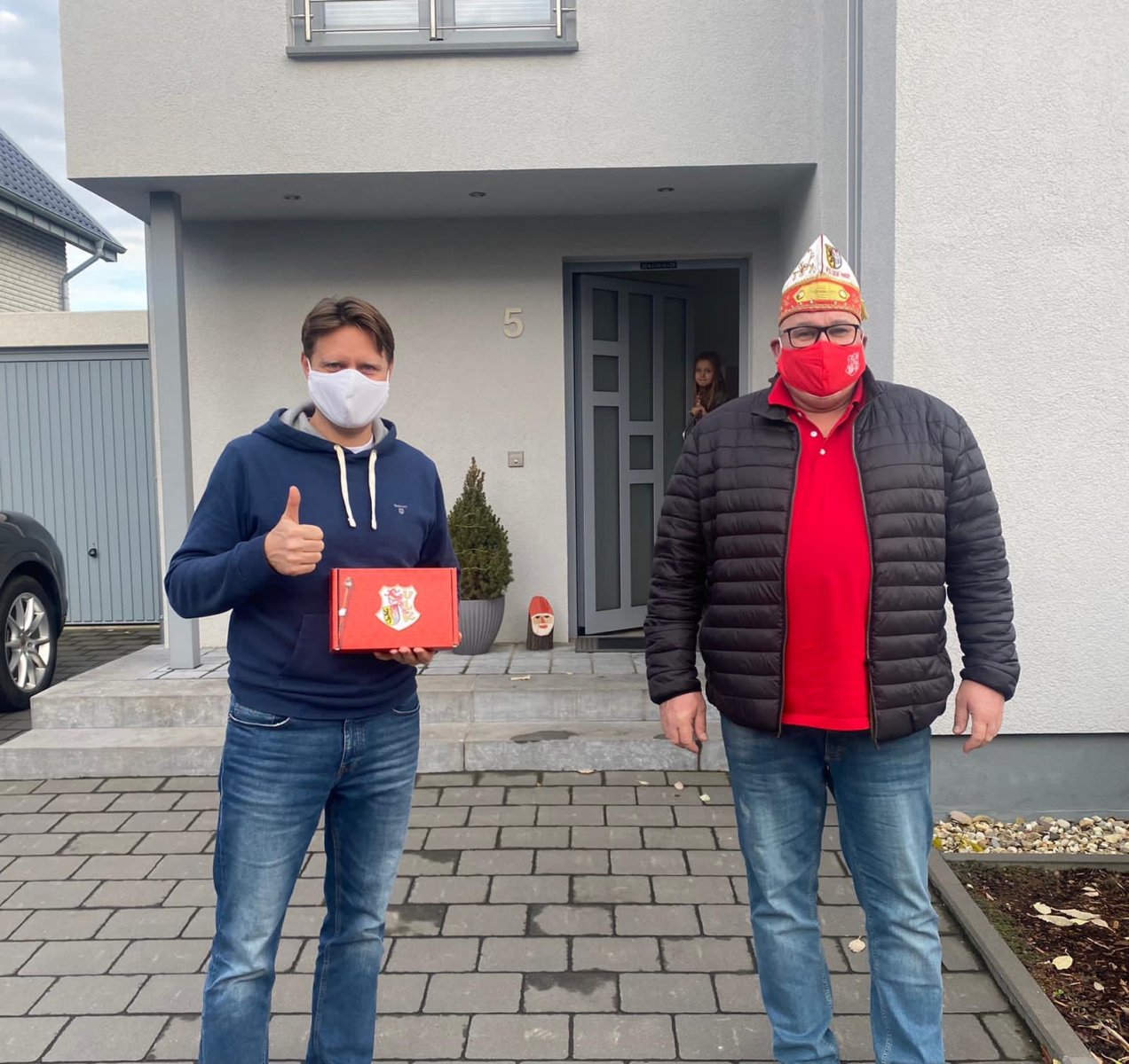 Trotz dieser Generalabsage machte sich der Kleine Rat viele Gedanken über den persönlichen Kontakt zu seinen Senatorinnen und Senatoren, die unserer Gesellschaft in bemerkenswerter Weise ihre Treue hielten. Dafür an dieser Stelle nochmal ein riesiger Dank. Und so kam es, dass wir vor Weihnachten – im Dezember 2020 – unsere sogenannten „ULK-Boxen“ zu den Senatorinnen und Senatoren nach Hause brachten. Darin unter anderem der Sessionsorden, eine ULK-Maske, ein Prosecco, eine Konfettikanone oder eine rote Clownsnase. Außerdem lag in jeder Box unser Sessionsmagazin, das in anderer Form über die Geschehnisse rund um unsere KG berichtete: So wurden im Heft die 22 neuen Senatorinnen und Senatoren sowie die 3 neuen Jugendsenatsmitglieder vorgestellt oder ein Interview mit unserem ULK-Vize und Bürgermeister Axel Fuchs veröffentlicht. Impressionen vom Verteilen unserer ULK-Box gibt es hier: