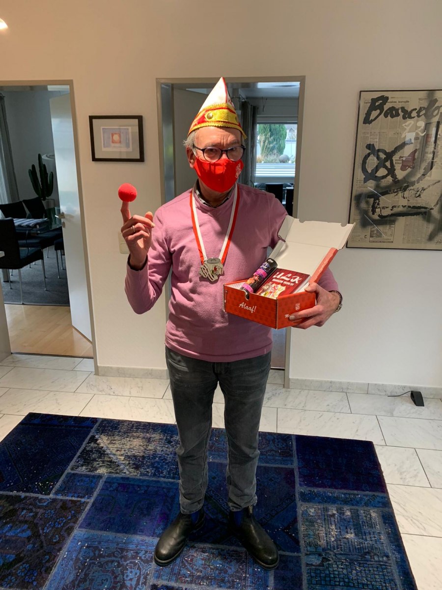 Trotz dieser Generalabsage machte sich der Kleine Rat viele Gedanken über den persönlichen Kontakt zu seinen Senatorinnen und Senatoren, die unserer Gesellschaft in bemerkenswerter Weise ihre Treue hielten. Dafür an dieser Stelle nochmal ein riesiger Dank. Und so kam es, dass wir vor Weihnachten – im Dezember 2020 – unsere sogenannten „ULK-Boxen“ zu den Senatorinnen und Senatoren nach Hause brachten. Darin unter anderem der Sessionsorden, eine ULK-Maske, ein Prosecco, eine Konfettikanone oder eine rote Clownsnase. Außerdem lag in jeder Box unser Sessionsmagazin, das in anderer Form über die Geschehnisse rund um unsere KG berichtete: So wurden im Heft die 22 neuen Senatorinnen und Senatoren sowie die 3 neuen Jugendsenatsmitglieder vorgestellt oder ein Interview mit unserem ULK-Vize und Bürgermeister Axel Fuchs veröffentlicht. Impressionen vom Verteilen unserer ULK-Box gibt es hier:
