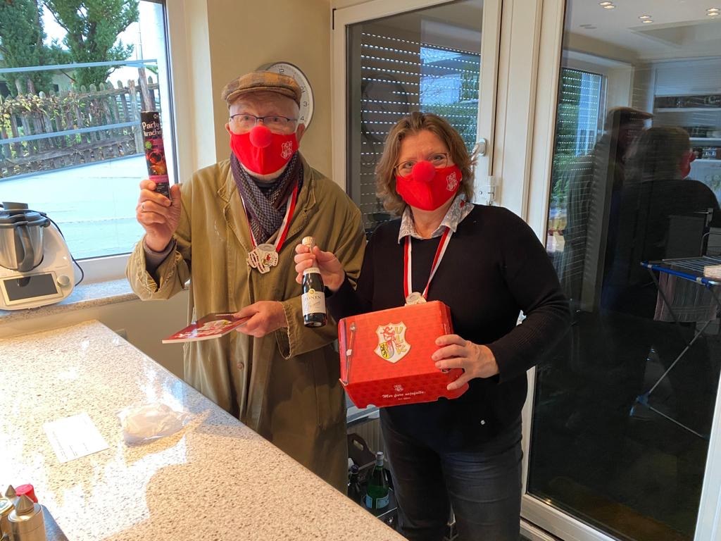 Trotz dieser Generalabsage machte sich der Kleine Rat viele Gedanken über den persönlichen Kontakt zu seinen Senatorinnen und Senatoren, die unserer Gesellschaft in bemerkenswerter Weise ihre Treue hielten. Dafür an dieser Stelle nochmal ein riesiger Dank. Und so kam es, dass wir vor Weihnachten – im Dezember 2020 – unsere sogenannten „ULK-Boxen“ zu den Senatorinnen und Senatoren nach Hause brachten. Darin unter anderem der Sessionsorden, eine ULK-Maske, ein Prosecco, eine Konfettikanone oder eine rote Clownsnase. Außerdem lag in jeder Box unser Sessionsmagazin, das in anderer Form über die Geschehnisse rund um unsere KG berichtete: So wurden im Heft die 22 neuen Senatorinnen und Senatoren sowie die 3 neuen Jugendsenatsmitglieder vorgestellt oder ein Interview mit unserem ULK-Vize und Bürgermeister Axel Fuchs veröffentlicht. Impressionen vom Verteilen unserer ULK-Box gibt es hier: