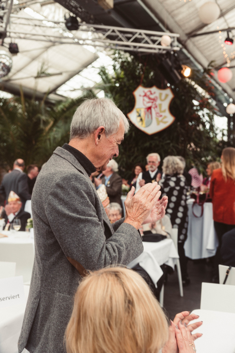Ein emotionaler Höhepunkt für die ULK-Familie war darüber hinaus die Auszeichnung unseres mittlerweile 93 Jahre alten Kleinen-Rats-Bruders Berthold Rey für 65 Jahre Kleiner Rat. „Bätes“, der für den ULK jahrelang in der Bütt brillierte, erhielt mit dem goldenen Till eine Ehrung, die bis dato nur ein einziges weiteres Mal verliehen wurde: unserem verstorbenen Ehrenpräsidenten Matthias Hellmann. Matthias‘ Nachfolger Jörg Bücher würdigte Berthold als ein „absolutes ULK-Urgestein, das jede Menge für unsere Gesellschaft geleistet hat“. Heino Bücher legte nach: „Ich habe an Berthold immer seinen feinen Humor bewundert. Er war für mich ein Vorbild und Inspiration, überhaupt den Schritt in die Bütt zu wagen!“