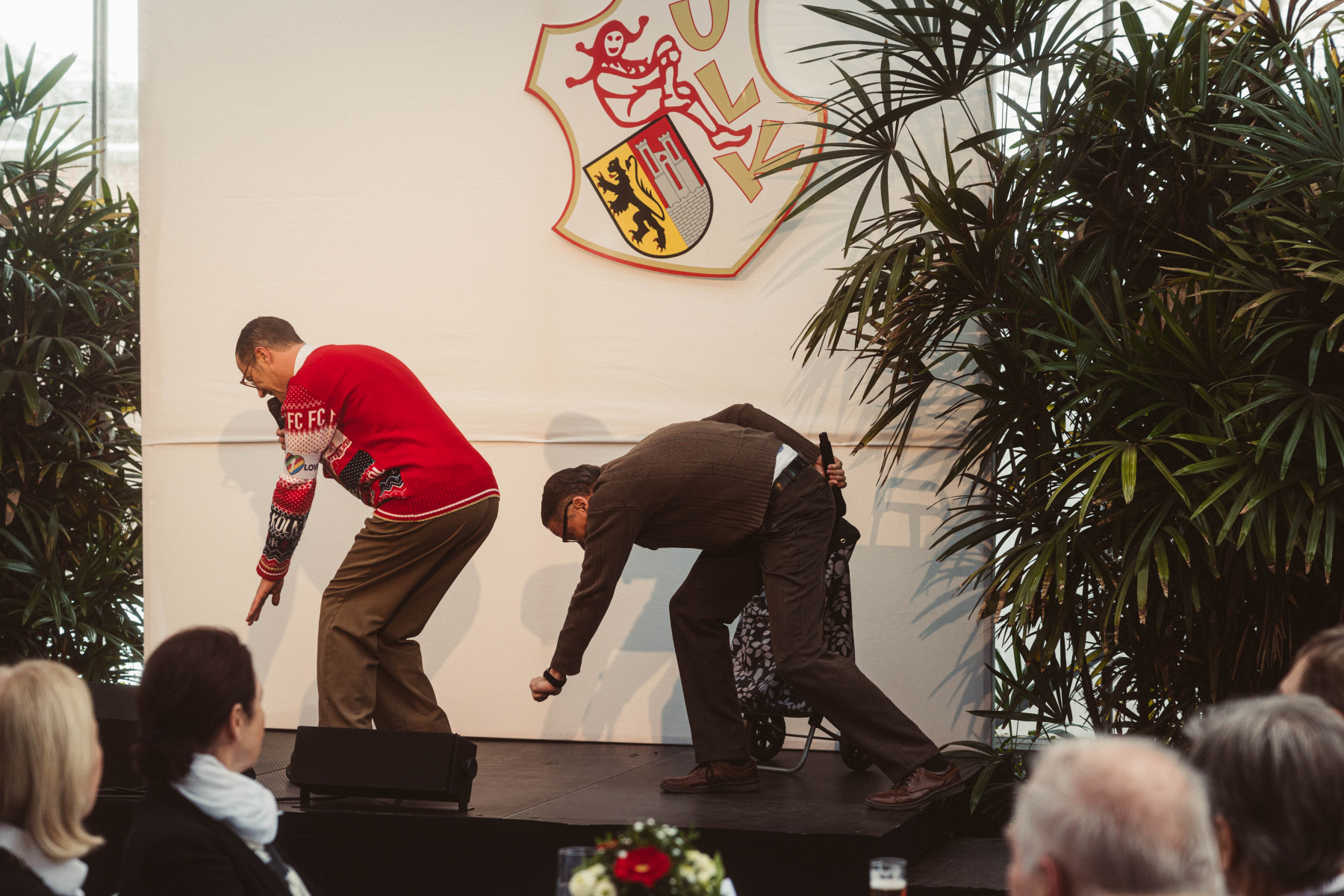 Den ulkigen Gesprächs-Part rundete eine Talk-Runde auf der Bühne ab. Unser Pressesprecher Christoph Küppers, im echten Leben TV-Journalist, interviewte jahrelange ULK-Freundinnen und -Freunde wie Claudia Hellmann, Heino Bücher, Frank Lafos sowie Frank Müller. Letzterer hatte extra für den Tag sein legendäres Zeremonienmeister-Kostüm aus dem Schrank geholt und beichtete Künstler Wicky Junggeburth ein Malheur früherer Tage: Bei einer ULK-Sitzung in den 2000ern hatte „Fränkie“ beim schwungvollen Bühnentanz aus Versehen Wickys Gitarre tuschiert. Wicky nahm diesen verjährten Unfall „Bösewicht Müller“ keinesfalls übel und seinen Kompagnon, der ihn nach eigenen Angaben „das eine oder andere Mal in Jülich in den Wahnsinn tanzte“, liebevoll in den Arm.