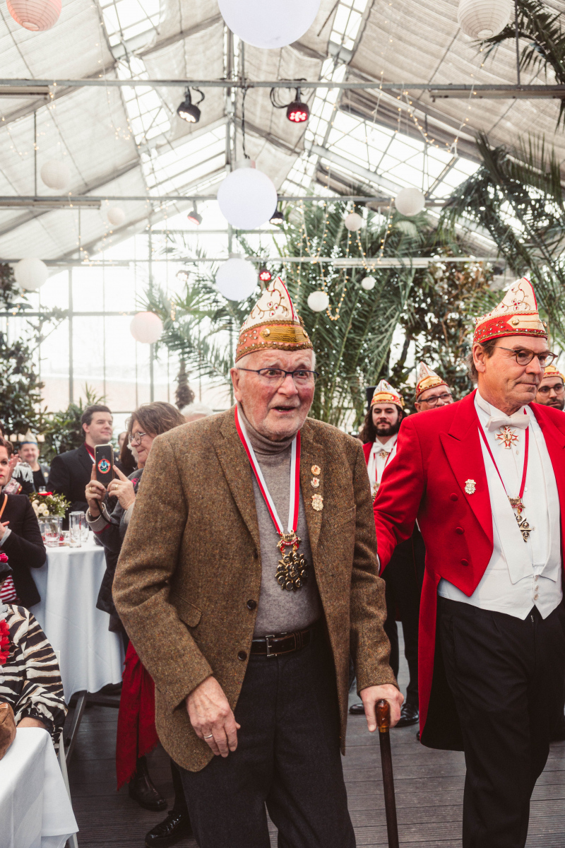 Ein emotionaler Höhepunkt für die ULK-Familie war darüber hinaus die Auszeichnung unseres mittlerweile 93 Jahre alten Kleinen-Rats-Bruders Berthold Rey für 65 Jahre Kleiner Rat. „Bätes“, der für den ULK jahrelang in der Bütt brillierte, erhielt mit dem goldenen Till eine Ehrung, die bis dato nur ein einziges weiteres Mal verliehen wurde: unserem verstorbenen Ehrenpräsidenten Matthias Hellmann. Matthias‘ Nachfolger Jörg Bücher würdigte Berthold als ein „absolutes ULK-Urgestein, das jede Menge für unsere Gesellschaft geleistet hat“. Heino Bücher legte nach: „Ich habe an Berthold immer seinen feinen Humor bewundert. Er war für mich ein Vorbild und Inspiration, überhaupt den Schritt in die Bütt zu wagen!“
