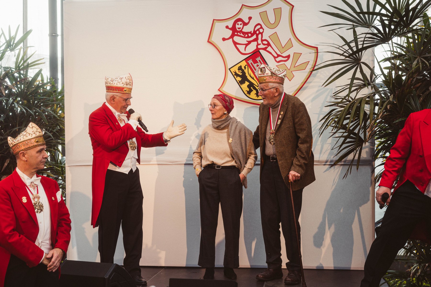 Ein emotionaler Höhepunkt für die ULK-Familie war darüber hinaus die Auszeichnung unseres mittlerweile 93 Jahre alten Kleinen-Rats-Bruders Berthold Rey für 65 Jahre Kleiner Rat. „Bätes“, der für den ULK jahrelang in der Bütt brillierte, erhielt mit dem goldenen Till eine Ehrung, die bis dato nur ein einziges weiteres Mal verliehen wurde: unserem verstorbenen Ehrenpräsidenten Matthias Hellmann. Matthias‘ Nachfolger Jörg Bücher würdigte Berthold als ein „absolutes ULK-Urgestein, das jede Menge für unsere Gesellschaft geleistet hat“. Heino Bücher legte nach: „Ich habe an Berthold immer seinen feinen Humor bewundert. Er war für mich ein Vorbild und Inspiration, überhaupt den Schritt in die Bütt zu wagen!“