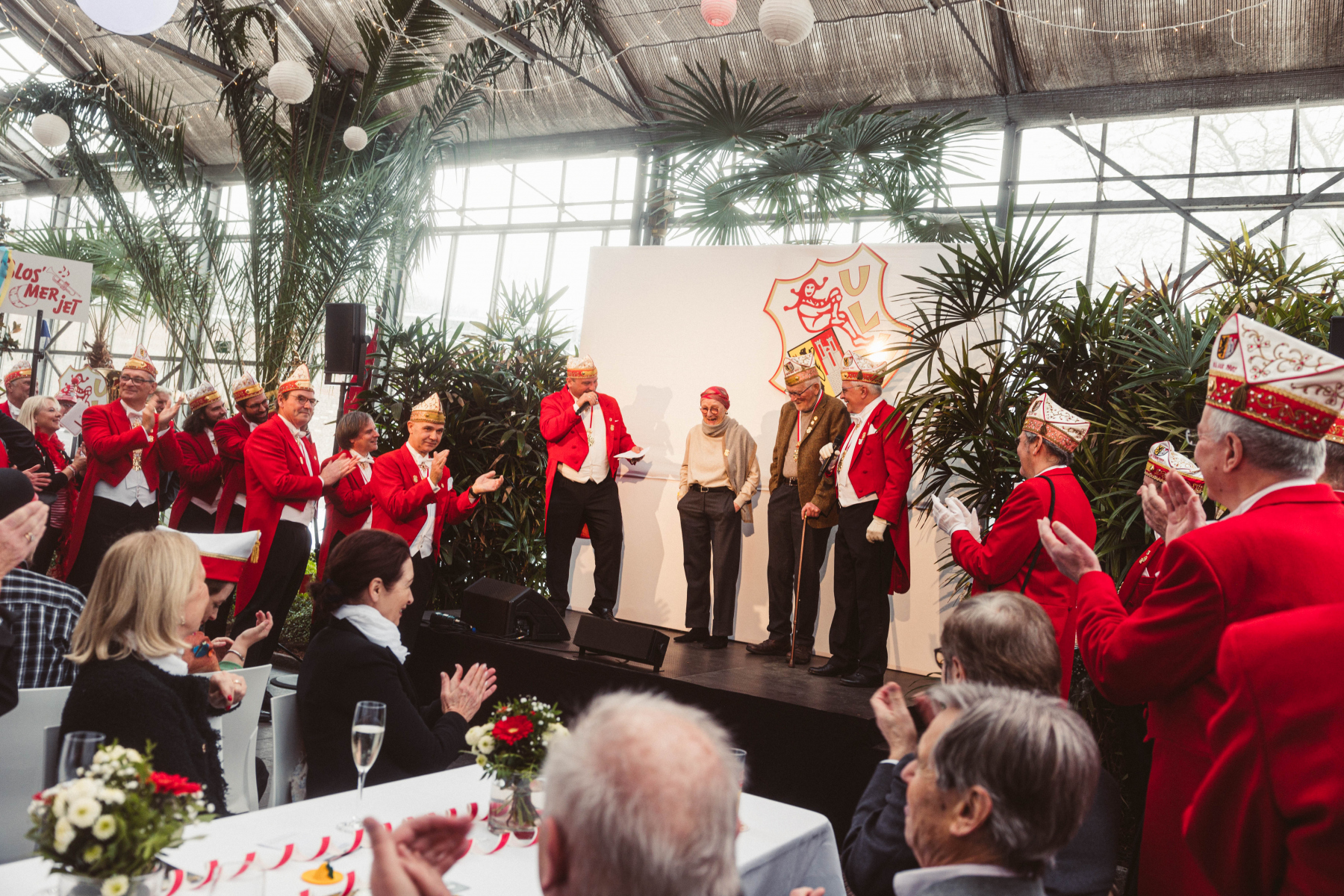 Ein emotionaler Höhepunkt für die ULK-Familie war darüber hinaus die Auszeichnung unseres mittlerweile 93 Jahre alten Kleinen-Rats-Bruders Berthold Rey für 65 Jahre Kleiner Rat. „Bätes“, der für den ULK jahrelang in der Bütt brillierte, erhielt mit dem goldenen Till eine Ehrung, die bis dato nur ein einziges weiteres Mal verliehen wurde: unserem verstorbenen Ehrenpräsidenten Matthias Hellmann. Matthias‘ Nachfolger Jörg Bücher würdigte Berthold als ein „absolutes ULK-Urgestein, das jede Menge für unsere Gesellschaft geleistet hat“. Heino Bücher legte nach: „Ich habe an Berthold immer seinen feinen Humor bewundert. Er war für mich ein Vorbild und Inspiration, überhaupt den Schritt in die Bütt zu wagen!“