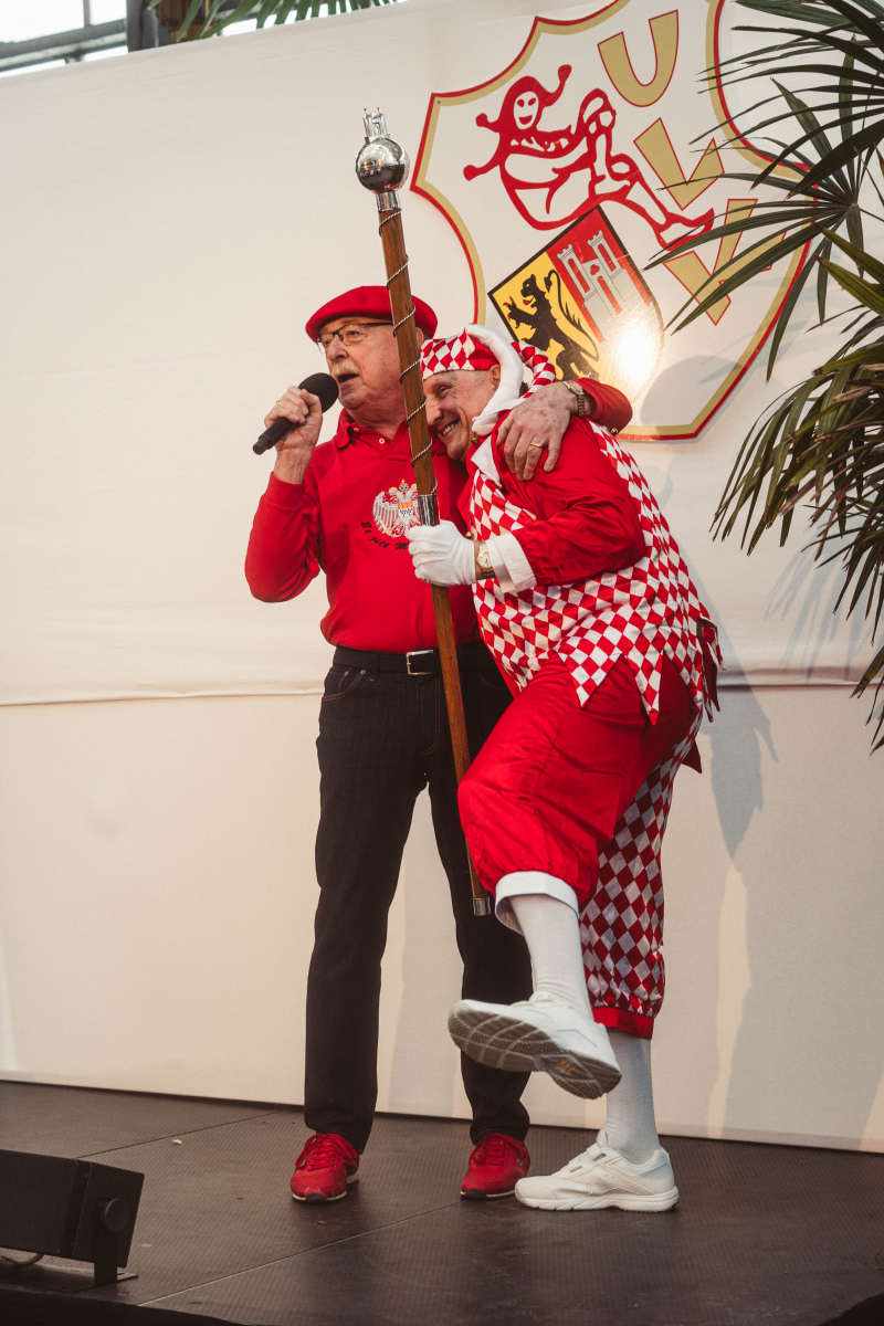 Ein emotionaler Höhepunkt für die ULK-Familie war darüber hinaus die Auszeichnung unseres mittlerweile 93 Jahre alten Kleinen-Rats-Bruders Berthold Rey für 65 Jahre Kleiner Rat. „Bätes“, der für den ULK jahrelang in der Bütt brillierte, erhielt mit dem goldenen Till eine Ehrung, die bis dato nur ein einziges weiteres Mal verliehen wurde: unserem verstorbenen Ehrenpräsidenten Matthias Hellmann. Matthias‘ Nachfolger Jörg Bücher würdigte Berthold als ein „absolutes ULK-Urgestein, das jede Menge für unsere Gesellschaft geleistet hat“. Heino Bücher legte nach: „Ich habe an Berthold immer seinen feinen Humor bewundert. Er war für mich ein Vorbild und Inspiration, überhaupt den Schritt in die Bütt zu wagen!“