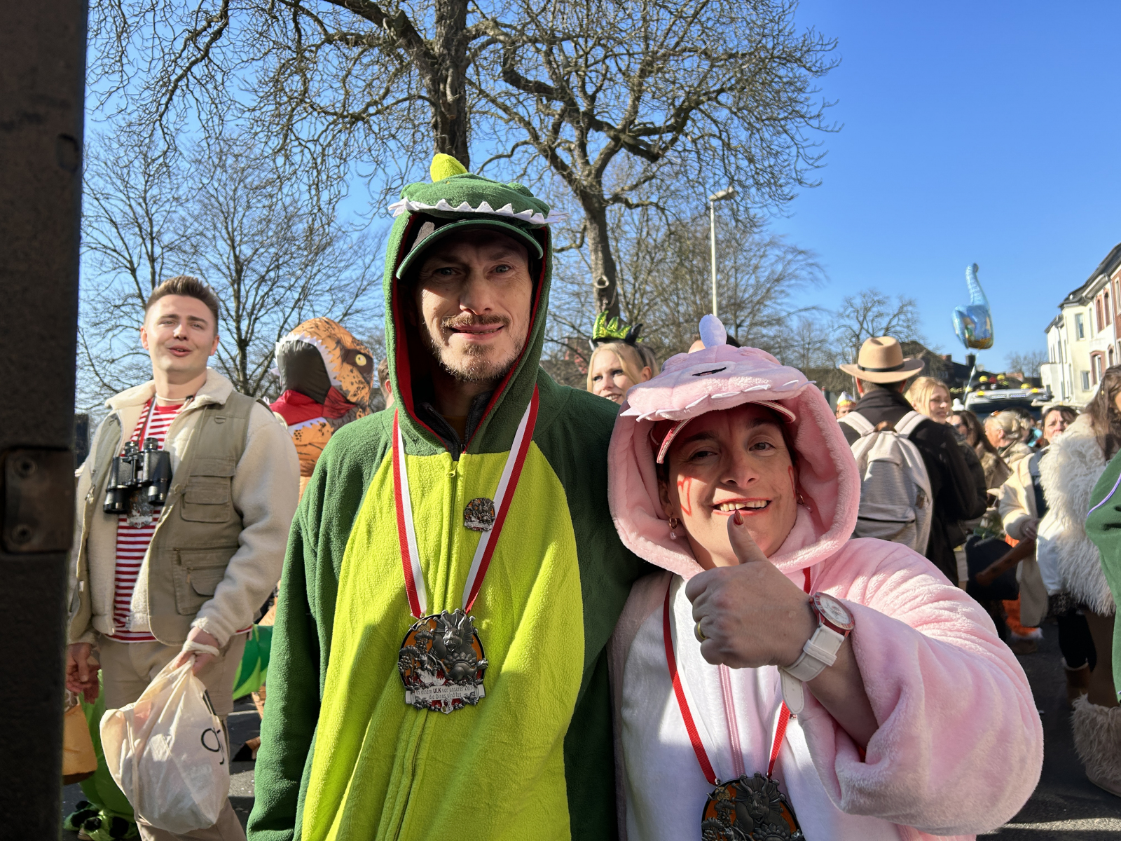 Gegen 13.30 Uhr machte sich die ULK-Gruppe dann auf den Weg in Richtung Zugaufstellung auf der Ellbachstraße – erstmals übrigens begleitet von einem neuen Wagen: Der alte Schiebewagen wurde in den letzten Wochen durch einen Hänger ersetzt, der in diesem Jahr als „Dino-Kiste“ geschmückt daherkam. Ein Lob an die Wagenbauer um Lars Zopp, Carsten Buntenbruch, Ferdi Wagemann, Tobi Rau, Ilias Abdellaoui und „Küken“ Wolfgang Koll für den unermüdlichen Einsatz rund um dieses neue ULK-Schmuckstück. Explizit möchten wir außerdem unseren freiwilligen Wagenengeln danken, die im Zug jederzeit in nicht immer ganz übersichtlichen Situationen für Sicherheit sorgten!