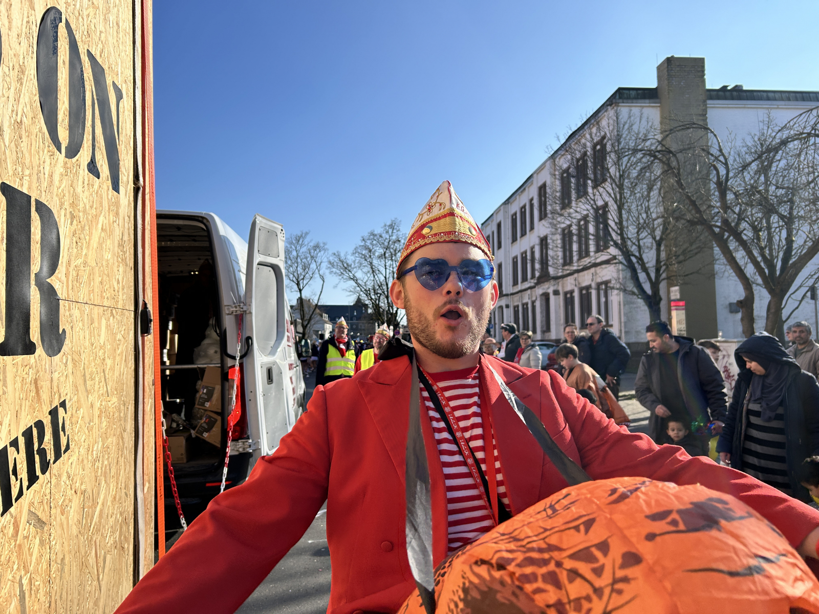 Gegen 13.30 Uhr machte sich die ULK-Gruppe dann auf den Weg in Richtung Zugaufstellung auf der Ellbachstraße – erstmals übrigens begleitet von einem neuen Wagen: Der alte Schiebewagen wurde in den letzten Wochen durch einen Hänger ersetzt, der in diesem Jahr als „Dino-Kiste“ geschmückt daherkam. Ein Lob an die Wagenbauer um Lars Zopp, Carsten Buntenbruch, Ferdi Wagemann, Tobi Rau, Ilias Abdellaoui und „Küken“ Wolfgang Koll für den unermüdlichen Einsatz rund um dieses neue ULK-Schmuckstück. Explizit möchten wir außerdem unseren freiwilligen Wagenengeln danken, die im Zug jederzeit in nicht immer ganz übersichtlichen Situationen für Sicherheit sorgten!