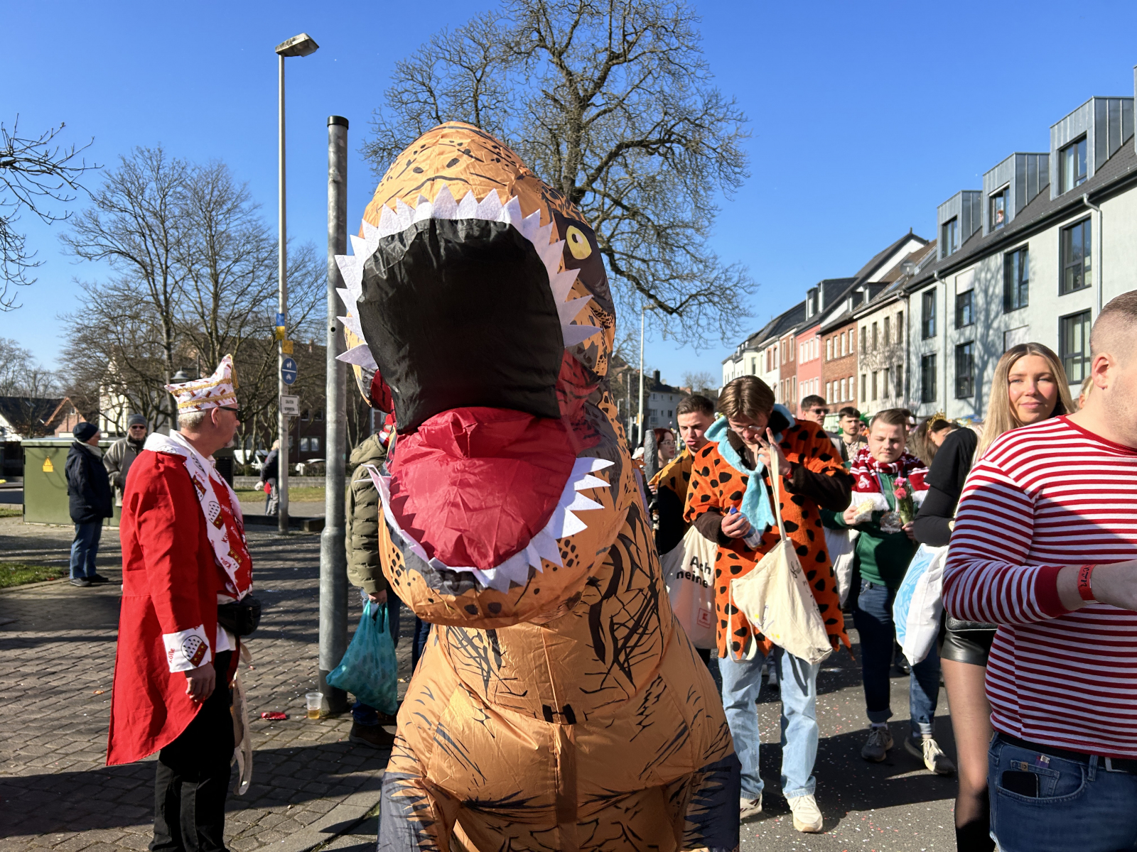 Gegen 13.30 Uhr machte sich die ULK-Gruppe dann auf den Weg in Richtung Zugaufstellung auf der Ellbachstraße – erstmals übrigens begleitet von einem neuen Wagen: Der alte Schiebewagen wurde in den letzten Wochen durch einen Hänger ersetzt, der in diesem Jahr als „Dino-Kiste“ geschmückt daherkam. Ein Lob an die Wagenbauer um Lars Zopp, Carsten Buntenbruch, Ferdi Wagemann, Tobi Rau, Ilias Abdellaoui und „Küken“ Wolfgang Koll für den unermüdlichen Einsatz rund um dieses neue ULK-Schmuckstück. Explizit möchten wir außerdem unseren freiwilligen Wagenengeln danken, die im Zug jederzeit in nicht immer ganz übersichtlichen Situationen für Sicherheit sorgten!