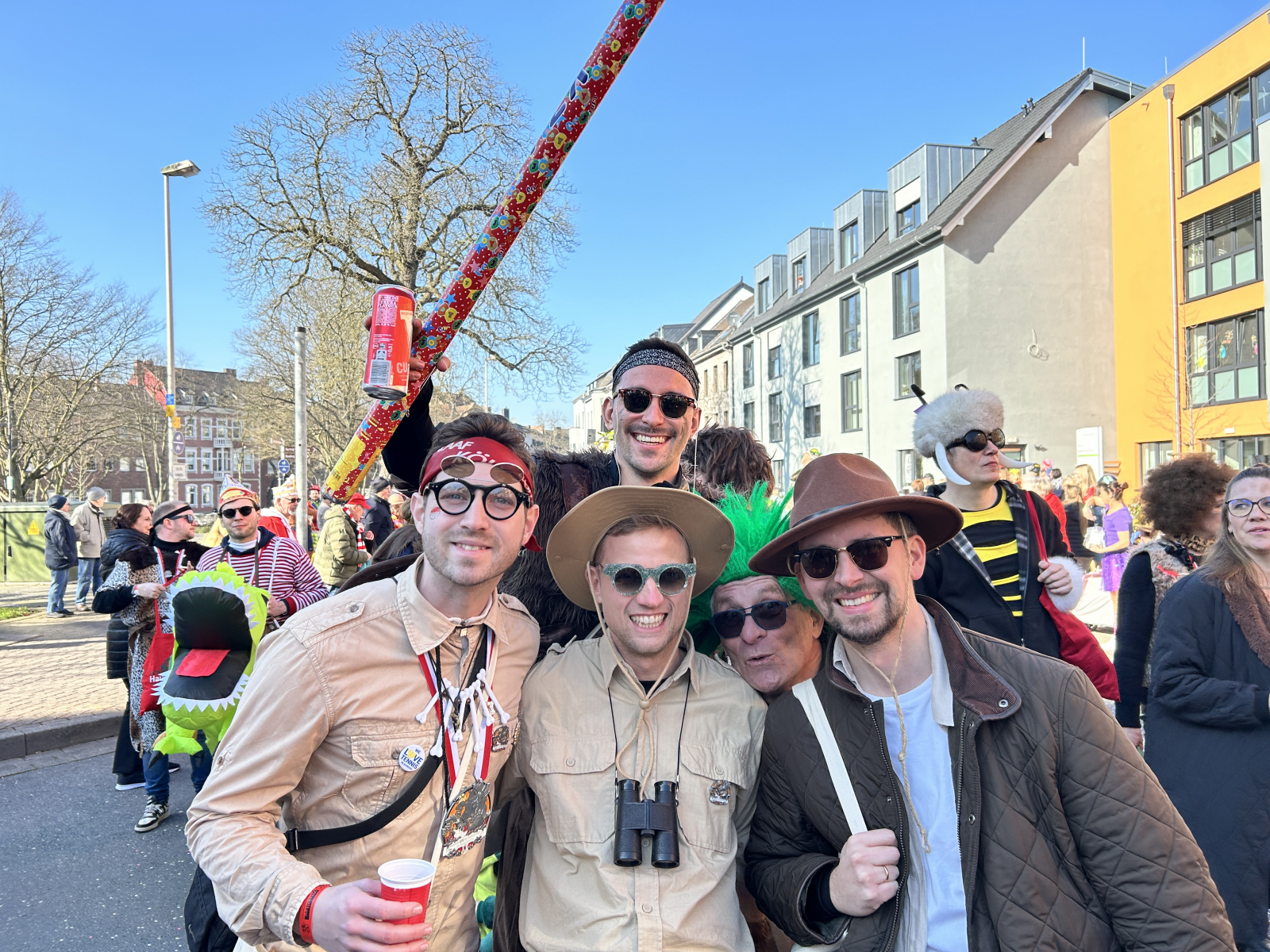 Gegen 13.30 Uhr machte sich die ULK-Gruppe dann auf den Weg in Richtung Zugaufstellung auf der Ellbachstraße – erstmals übrigens begleitet von einem neuen Wagen: Der alte Schiebewagen wurde in den letzten Wochen durch einen Hänger ersetzt, der in diesem Jahr als „Dino-Kiste“ geschmückt daherkam. Ein Lob an die Wagenbauer um Lars Zopp, Carsten Buntenbruch, Ferdi Wagemann, Tobi Rau, Ilias Abdellaoui und „Küken“ Wolfgang Koll für den unermüdlichen Einsatz rund um dieses neue ULK-Schmuckstück. Explizit möchten wir außerdem unseren freiwilligen Wagenengeln danken, die im Zug jederzeit in nicht immer ganz übersichtlichen Situationen für Sicherheit sorgten!